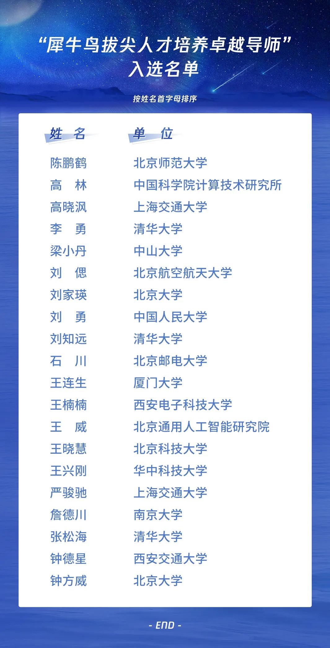 在过去的十年中,多位犀牛鸟学者深度参与了拔尖人才培养项目,投入了大量的时间和精力将自己的知识、思考和实践经验传授给学生们,并为拔尖人才培养的创新模式提供宝贵的意见建议。在犀牛鸟十周年之际,特设立"犀牛鸟拔尖人才培养卓越导师"奖,用以表彰在其中做出卓越贡献的学者们。本次评选评审专家从过往十年中参与人才培养项目的500多位犀牛鸟学者中选拔出20位获奖学者,他们在整体投入、培养成果和创新探索等多维度均起到表率作用,堪称学生们心目的金牌导师。