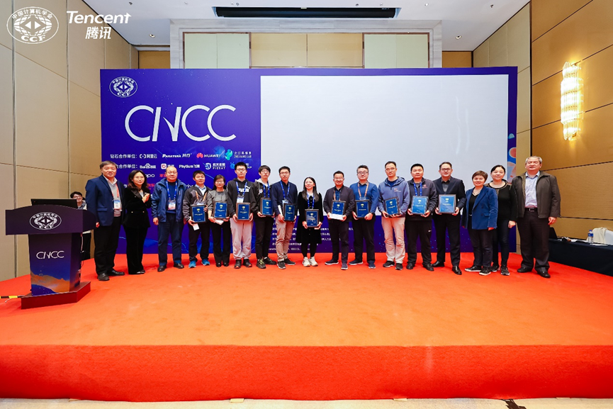 CCF副理事长、华中科技大学金海教授,腾讯公司副总裁王巨宏女士,北京邮电大学杜军平教授,北京大学深圳研究生院邹月娴教授,中国科学院计算技术研究所何清研究员和北京大学谢冰教授共同为卓越导师颁奖