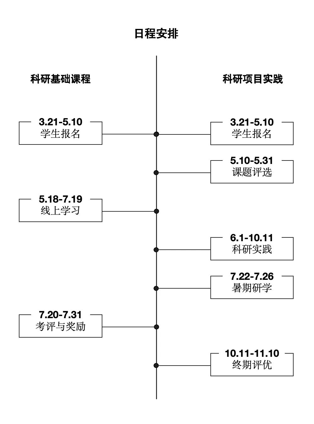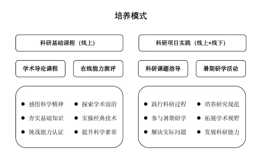 本计划由“科研基础课程”与“科研项目实践”两部分组成双轨制的教学体系。科研基础课程侧重信息技术领域科研基础概念与知识的普及;科研项目实践侧重个人/团队在导师指导下开展具体的科学研究工作,提升科学研究的基础能力。两个部分相互独立,互有联系。学生可根据实际需求单独或同时报名参与。