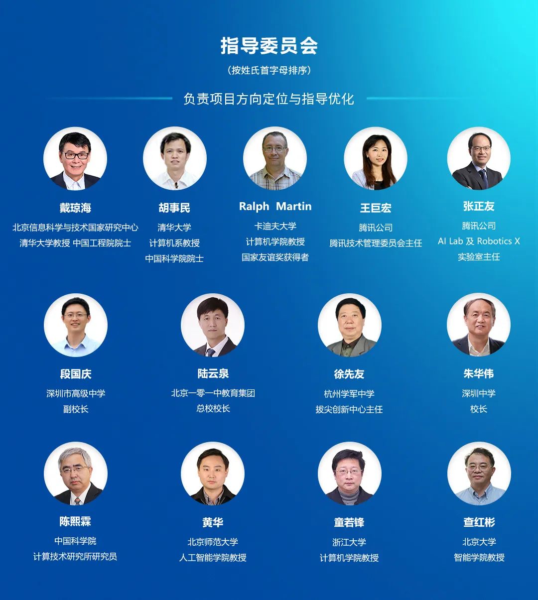 本计划由中国工程院院士、清华大学戴琼海教授,中国科学院院士、清华大学胡事民教授,腾讯公司技术管理委员会主任王巨宏女士,国家友谊奖获得者、英国卡迪夫大学计算机学院Ralph Martin教授,腾讯AI Lab及Robotics X实验室主任张正友博士等教育界、产业界知名专家担任指导委员会委员,为各项工作提供指导。