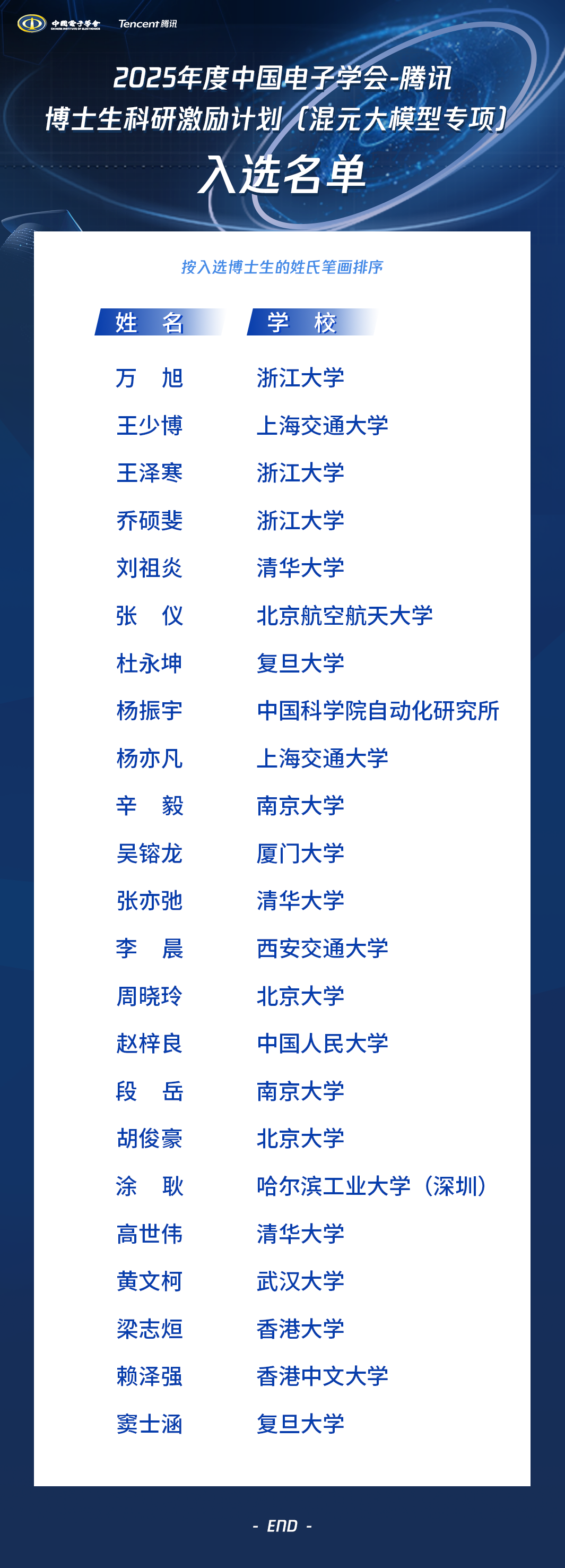 为加快产学研深度融合,推动新质生产力提升,培养AI拔尖人才,中国电子学会联合腾讯公司于2024年共同发起了“中国电子学会-腾讯博士生科研激励计划(混元大模型专项)”,旨在面向对大模型研究有浓厚兴趣和明确目标的优秀博士生提供支持,助力他们开展前沿研究及海内外交流访学等。入选学生将获得为期一年的10万元/人的科研资助,以及科研平台等其他支持。