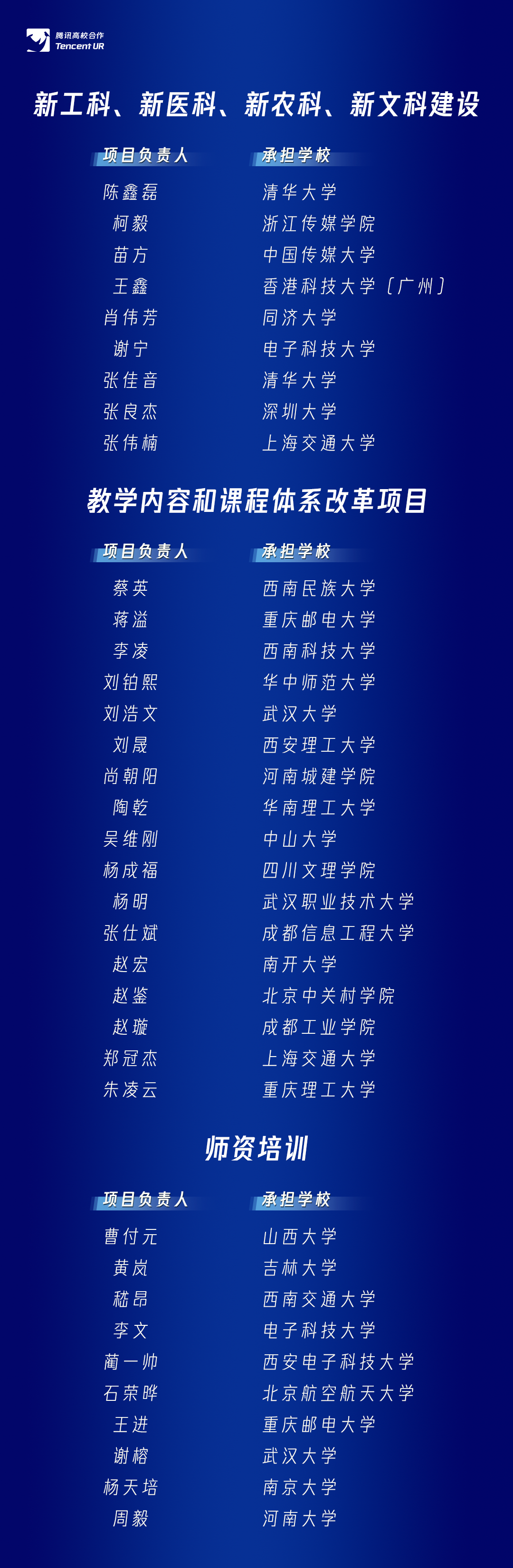 在教育部高教司指导下,腾讯公司组织专家对2025年腾讯产学合作协同育人项目进行评审,遴选出新工科、新医科、新农科、新文科建设项目、教学内容和课程体系改革项目、师资培训项目共计36项予以支持,拟立项名单如下(按姓氏首字母排序):