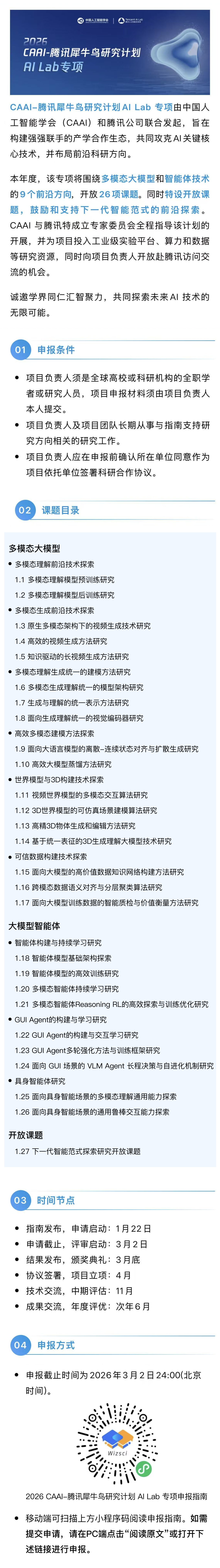 开放申请 | 2026 CAAI-腾讯犀牛鸟研究计划AI Lab专项 2026年01月22日 浏览 (354) 腾讯AI Lab犀牛鸟专项 https://www.wizsci.com/project/detail/1769